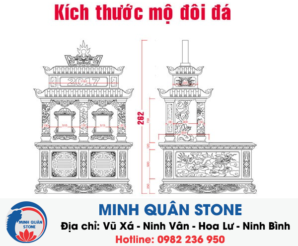- Mộ đôi đá dùng cho hai hoặc nhiều người, để có kích thước mộ đôi cân đối thì chiều mặt tiền thường lớn hơn hoặc bằng chiều sâu. Ví dụ một số kích thước mộ đôi theo thước Lỗ Ban phong thủy như :